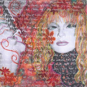 This is a 12×12 journal canvas that is one of five in a theme of obsessive love and compulsive thoughts. The title is “Off the Rack” and is composed from two original photographs, a background of tissue paper, heavy stenciling, working back in with acrylics and brush and then journaling on her face with pencil and on the canvas with white Sharpie™ poster paint marker. When these pieces appeared in a show, I was surprised that men were as interested in them as women.