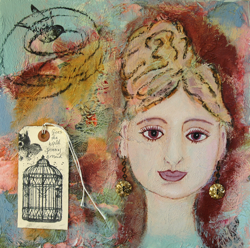 A new canvas from the last couple days, seems to be romantic. I’ve done three others with basically the same palette so it looks like a new series is born. Paper foundation with Mod Podge™, acrylic paint, buttons, tag stamped and journaled, then a whirl of charcoal with a stamped birdy. A little charcoal was used to define the hair. Found objects are sewn on, not glued, that way I know they are on there for good. I may make greeting cards from her, I think she’s sweet.