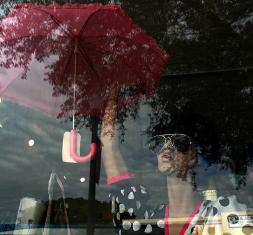 Another ARTpool Gallery shop window shot from Saturday. Normally I convert all my photos to black and white, with the exception of shots like this where the color becomes a statement. For some reason I am inordinately fond of umbrellas right now. I’ve bought some umbrella rubber stamps and always notice pictures that have umbrellas in them. The pink in this one is perfect, especially with the black and white polka dots which are a perennial favorite. Let your smile be your umbrella is a pretty good idea…I’ve heard worse. Have a happy one.