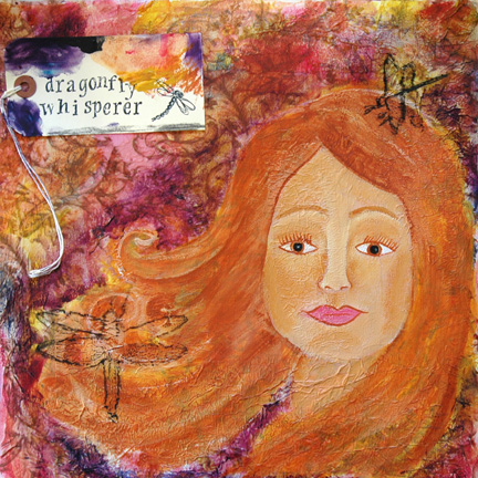 Here is a pretty strawberry blonde with a special affinity for dragonflies. She speaks to them softly as they zoom around the pond and the garden. I used a stencil from Balzar Designs by Crafter’s Workshop to rough in the features, acrylic paint, a paper background and charcoal doodles to finish the canvas off. Stenciling is a great way to get your face proportions correct and you can do any kind of eye, nose or mouth you want to use. It removes the need to be good at drawing facial features, the paint does most of the work for you.