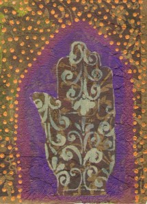 Get it, digit-al! Wow, is that bad. But this stencil from Crafters Workshop is not, it is detailed and makes a great image. Some of the lustrous quality of this canvas is lost because the scanner can’t pick up metallic well, but it was painted in part with Lumiere metallic paints on a paper background. Pointilism is also in metallic copper-y gold. If I can find something cool in the way of a 3-D object that adds to this piece I will, but for now it is finished.