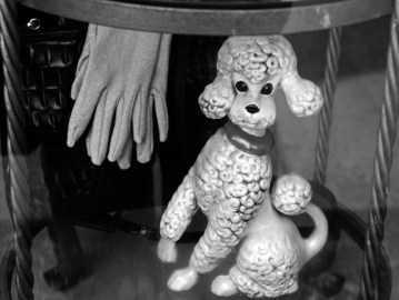 From the amazing January shop window at ARTpool Gallery comes this fun vignette of a vintage poodle sitting pretty on an etagere with a pair of gloves casually laid on the top shelf. I love the look on this poodles face and also his body posture. The only thing missing is the chain many of these knick knacks from the 50’s had around their necks. A photo like this can bring memories rushing back of our grandmothers or great aunts living rooms or vanity vignettes from back in the day. If that poodle could only talk? Why not look at old items in the thrift store, antique or retro shop and make a note of how many you remember, what houses you remember them from and who owned them. Were they favorites or despised gifts that had to be placed on show? Did they get passed around or passed down sacredly? My grandmother had a keychain bob that I called the purple horse, even though there was very little purple left on the figure and I can’t be sure if it was a horse or a seahorse at this date. But I remember it and several cool brass keys it held! Have a good time relating to these kitschy items and don’t forget your journal entries.