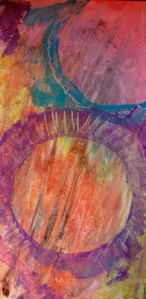 Nonesuch Moon is an expressive painting using a paper plate for a template, worked on a stretched canvas. Like some of my expressive paintings, it exists no more as the desire to paint portraits of women with moustaches took over and this canvas got repurposed. In order to preserve the lineage of work I do like to take pictures of finished work, even if (or especially if) I think it may only have a short life span. I like this painting and will very likely use this image in my journal at some point if I ever again get a color printer that works. In this way, paintings that no longer exist, whether the canvas was repurposed or the image was sold, can live on for the artist in current work. Be sure to document all your work with either photos or scans, if the work is small enough. Shoot the work at least 300 dpi so that you could have a greeting card or print made, and do a separate image at 72 dpi for the web display. I always keep the original photo in case either “saved” copy (your altered copies) get destroyed. Another idea for photo use of artwork is having a book made. Not as expensive as you might think and great fun to have. Comes in handy when visiting a new gallery or going out on an art date with friends to keep them updated on your progress. Happy painting and happy shooting!