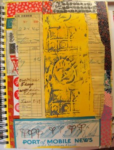 The first test page in my new journal, the Canson Artist Series All Media one. This page has a watercolor background in sunny yellow, washi paper, asian newspaper and graphic from a brochure for the border, a car repair receipt from 1940 off to the side of center and then two prints from a hand carved styrofoam plate in gray gesso. The journaling part is documentation of the germination of the seeds planted in my garden and little doodle drawings of the adorable sproutlings. I love working on pages like this that build from the scrap pile, then sing with a little handmade goodness like a spontaneous print.