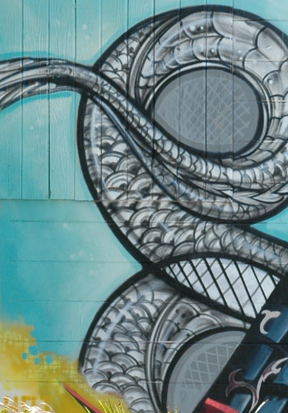 From yesterday’s full document style picture of graffiti in St. Pete, we have today’s first crop of crops. When I was looking at the full pix yesterday the most intriguing part for me, being a reptile lover, was the tail billowing from the back of the Viking warrior. The artist rendered the scales most beautifully, and I love the shape, which reminds me of an upended infinity symbol. I wanted most of the tail to show, but not all of it, so I sacrificed the very end. This creates the desirable effect of “lost and found”, which is also in play on the right side of the crop. It is more intriguing for the image to “wander off” the page, and return, than to see the whole thing, perhaps smaller, in the shot. Of course, this could have been even further cropped by showing only the one top curled part of the tail…there are always several good options when an image is well composed to begin with. But I liked the blue against the grey-the yellow against the blue-and the part of what might be a shield in the very bottom right, with it’s runic suggestion. Please notice that the middle of my crop is nearly empty of interest. What is there is merely moving the eye to something more interesting. All the action is in the thirds and in the very bottom corners. While the viewer has no real idea of the magnitude of the original “document”, the crop is satisfying on it’s own and that is what I think makes a successful vignette. It creates the desire to see more, but not an empty desire.