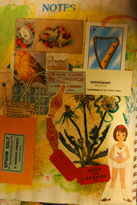 A bunch of stuff graces this page. The background was spray inked and I stamped a hand carved dandelion plant image (from Quik Cutz, not a styrofoam plate this time) onto the foundation. Then I began to layer on some ephemer. There are ration stamps, an epsom salt RX envelope, business cards, word cards, more RX labels and some Victorian scrap, plus a lotteria card. The cigar bands and red tickets create somewhat of a border around the dandelion image, and a cute little girl from what could be a paper doll sheet finishes the edge. This page does not feel finished to me. I think it needs a very thin wash of gesso or white acrylic to unify the items, or some journaling in white would accomplish the same idea.
