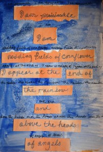 A new page in my watercolor journal. I’m calling them Poem Pages. The journaling derives from a writing assignment having to do with a favorite color and “I am” statements. The poem is written on watercolor paper and then washed in a light to medium tone. The statements are cut out and perhaps rearranged into a poetic collection. From there is is a matter of rewriting the poem in pen and doing some outlining of the handwriting to make it pop. I think it looks cooler in person than in the pix, plus it’s very overcast here today so not a lot of light in the photography station (ha! my dining chair in the kitchen!). Pick your favorite anything, write out what it’s like to be it, and make a poem today in your journal. This exercise will appear as Class Three in Art Journaling at Whim So Doodle in St. Pete, FL sometime in July.