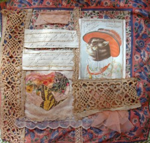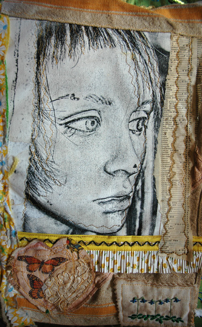 In the second frame running down the center you might be able to see a stitch line. A few years ago I got froggy and took a bunch of old photos out and stitched them together on the sewing machine. I used them to make fabric/paper hanging collages and some were left over when I got bored doing that. Old photos can be very fragile. They were often glued to scrapbooks and then get taken out and the force of removing them weakens the paper. As I was gelling this photo to the foundation paper, the bottom tore off. No big deal, just wanted to mention that they can get very delicate.
